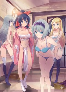 Elze and Linze’s were matching, having the same small ribbons, though they were different colors. Elze’s was pink, Linze’s was blue. Both pastel. The lower garments were tie-side panties. Yae, standing next to them, was wearing a sarashi breast wrap and a fundoshi. That wasn’t too surprising. Guess that was the standard in Eashen. Ah, the whiteness of it’s just blinding. Also, the sarashi’s a bit loose, so it’s clear that she actually has the biggest pair out of all of the girls. Last, but not least, Yumina. She was wearing expensive-looking, but not overly wild, white underwear with frills and laces. Just like the twins’, the lower part was tie-side. I could only assume that it was the panty standard of this world.