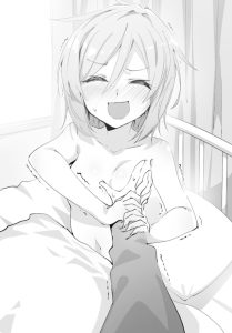 Mizuki’s eyes snapped open wide, and she frantically pulled the bedsheet over herself to hide her chest.